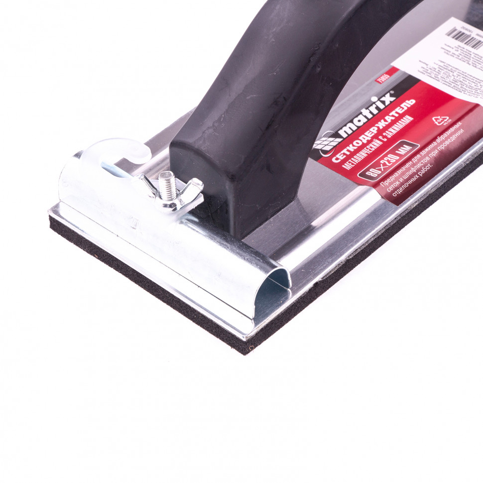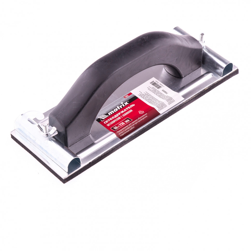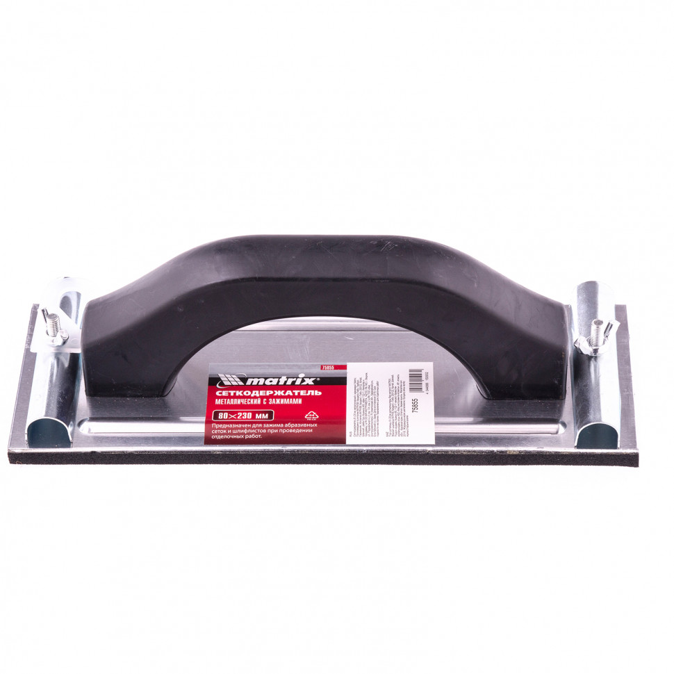 Сеткодержатель Matrix 75855, 80 х 230 мм, металлический с зажимами, используется для ручного шлифования деревянных, шпатлеванных, металлических, пластмассовых и прочих твердых поверхностей. Сеткодержатель фиксирует абразивную стеклосетку или шлифлист и позволяет удалять старые отделочные покрытия, подготавливать поверхность под покраску, а также выполнять чистовую обработку.