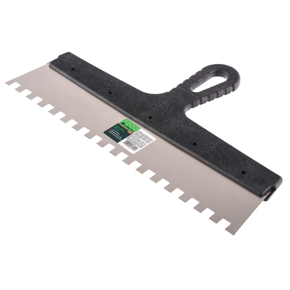 Шпатель Sparta 85507 шириной 350 мм, из нержавеющей стали, с пластмассовой ручкой и зубьями 10 х 10 мм, применяется для равномерного нанесения клея при укладке мелкоформатной плитки, мозаики и т.д. Квадратные зубья облегчают нанесение клеевого состава, позволяя ровно и экономно распределять его по поверхности. Зубья размером 10 х 10 мм рассчитаны на плитку площадью 900-2500 см2.