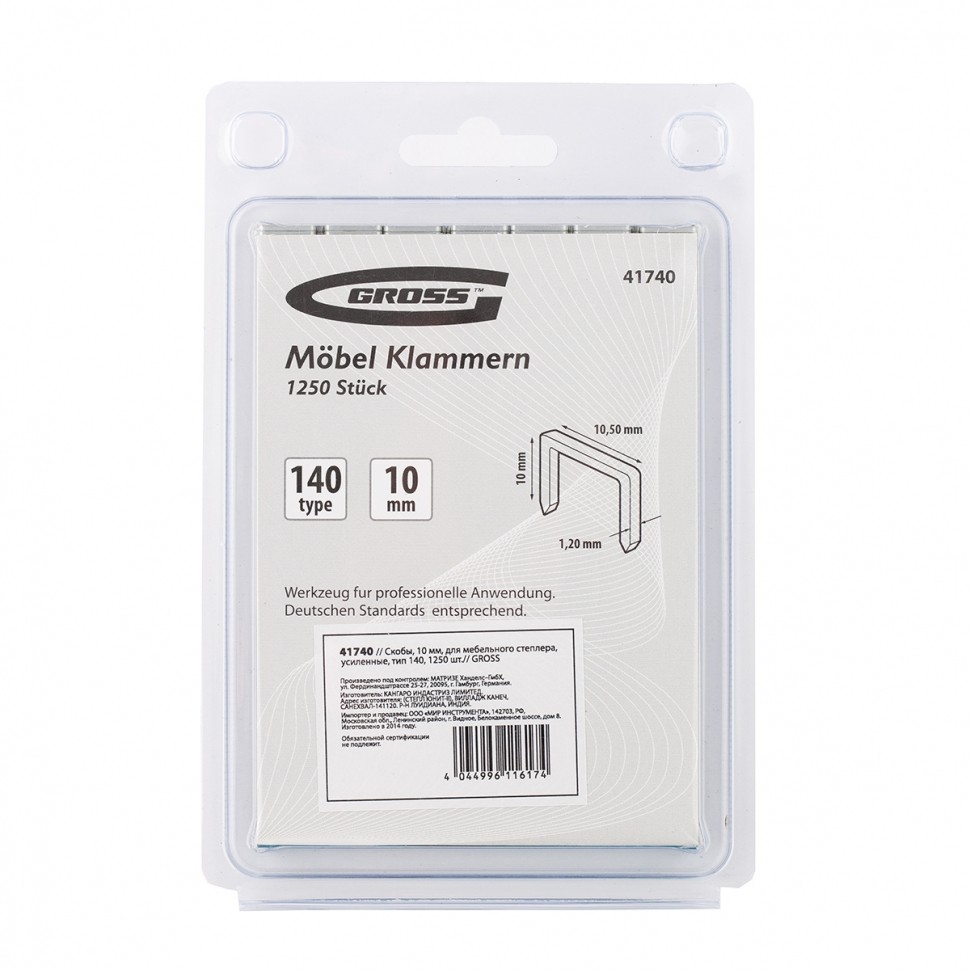 Усиленные скобы Gross 41740 размером 10 х 10,5 х 1,2 мм, тип 140, 1250 шт. в упаковке, предназначены для скрепления листовых материалов с помощью мебельного степлера. Позволяют зафиксировать картон, фанеру, ткань в ходе проведения облицовочных или ремонтных работ.