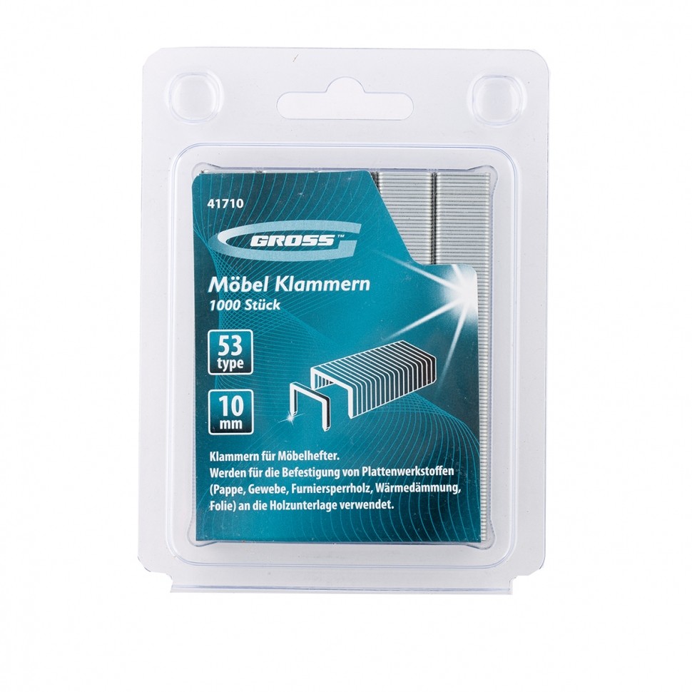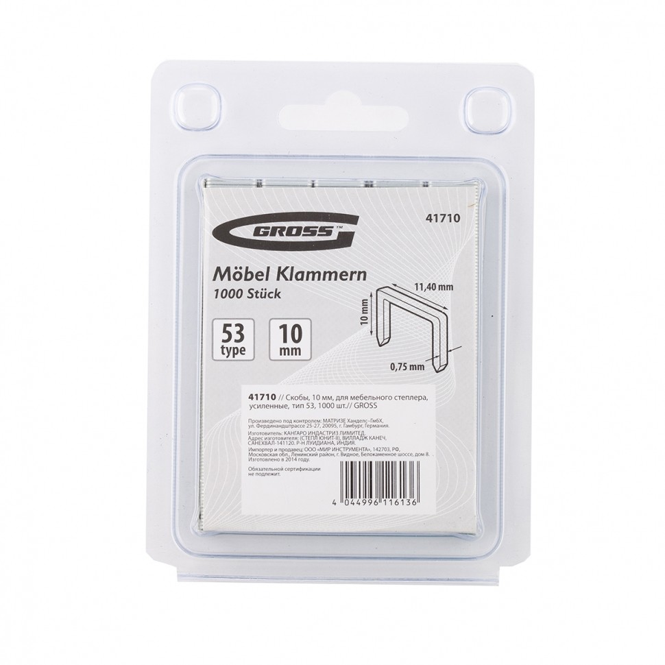 Усиленные скобы Gross 41710 размером 10 х 11,4 х 0,75 мм, тип 53, 1000 шт. в упаковке, предназначены для скрепления листовых материалов с помощью мебельного степлера. Позволяют зафиксировать картон, фанеру, ткань в ходе проведения облицовочных или ремонтных работ.