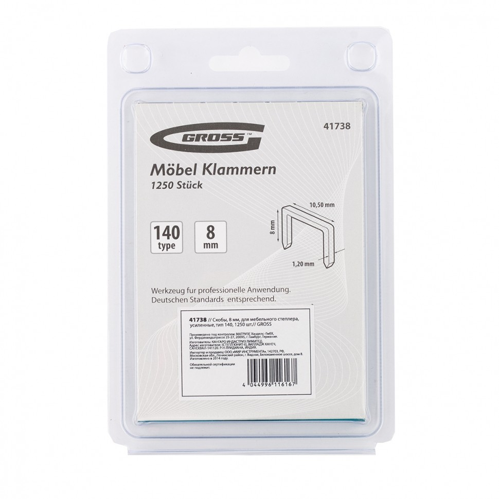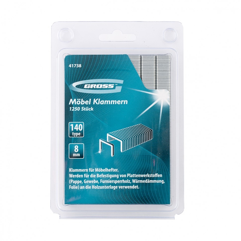 Усиленные скобы Gross 41738 размером 8 х 10,5 х 1,2 мм, тип 140, 1250 шт. в упаковке, предназначены для скрепления листовых материалов с помощью мебельного степлера. Позволяют зафиксировать картон, фанеру, ткань в ходе проведения облицовочных или ремонтных работ.