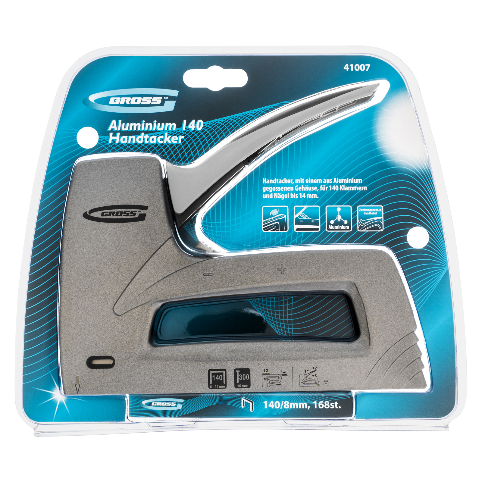 Мебельный степлер Gross Aluminium 140 41007 в литом алюминиевом корпусе работает со скобами типа 140 размером 6-14 мм и гвоздями типа 300 размером 16 мм, оснащен двухпозиционным регулятором силы удара и эффективен при работе с тканями, ПВХ-пленкой, а также фанерой, оргалитом, ДВП и ДСП. Используется для сборки и обивки мебели, укладки ковровых покрытий и проведения багетных работ. Благодаря прочному корпусу снижена вероятность поломки в результате падения. Двухпозиционный регулятор позволяет установить оптимальную силу удара в зависимости от плотности материала. Степлер подходит для использования дома и на производстве.