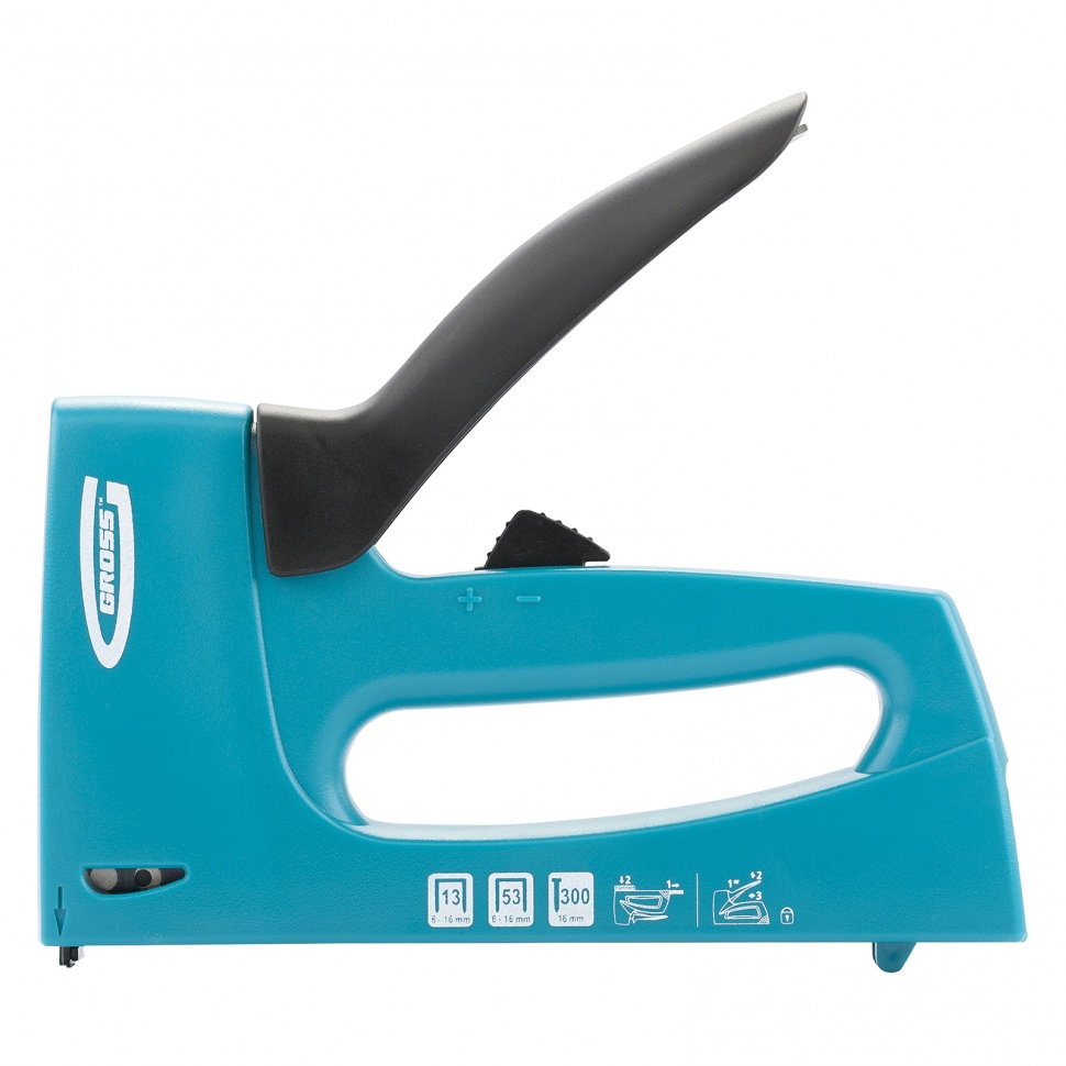 Мебельный степлер Gross 41003 в пластиковом корпусе, с функцией регулировки силы удара, совместим со скобами типа 13, 53 размером 6-16 мм и гвоздями типа 300 размером 16 мм. Его используют для быстрого крепления на деревянном основании фанеры, оргалита, ДВП, ДСП, пленки, утеплителя и других листовых материалов. Корпус устойчив к повреждениям, поскольку отлит из ударопрочного пластика. Двухпозиционный переключатель позволяет регулировать силу удара в зависимости от длины скоб и твердости материала. Действия в труднодоступных местах облегчает длинный тонкий носик. Инструмент идеально сбалансирован, что сводит отдачу к минимуму. Степлер пригодится при сборке и обшивке мебели, укладке ковровых покрытий и изоляционных материалов, выполнении багетных работ. Подходит для профессионального применения.