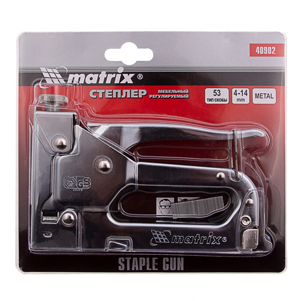 Регулируемый мебельный степлер Matrix 40902, предназначенный для скоб типа 53 размером 4-14 мм, используется для быстрого скрепления с деревянным основанием листовых материалов — фанеры, картона, оргалита, ДВП, ДСП, пленки или утеплителя. Корпус изготовлен методом штамповки из высококачественной стали, поэтому прочен и долговечен. Степлер пригодится для сборки и обивки мебели, монтажа теплоизоляции, а также будет полезен в быту.