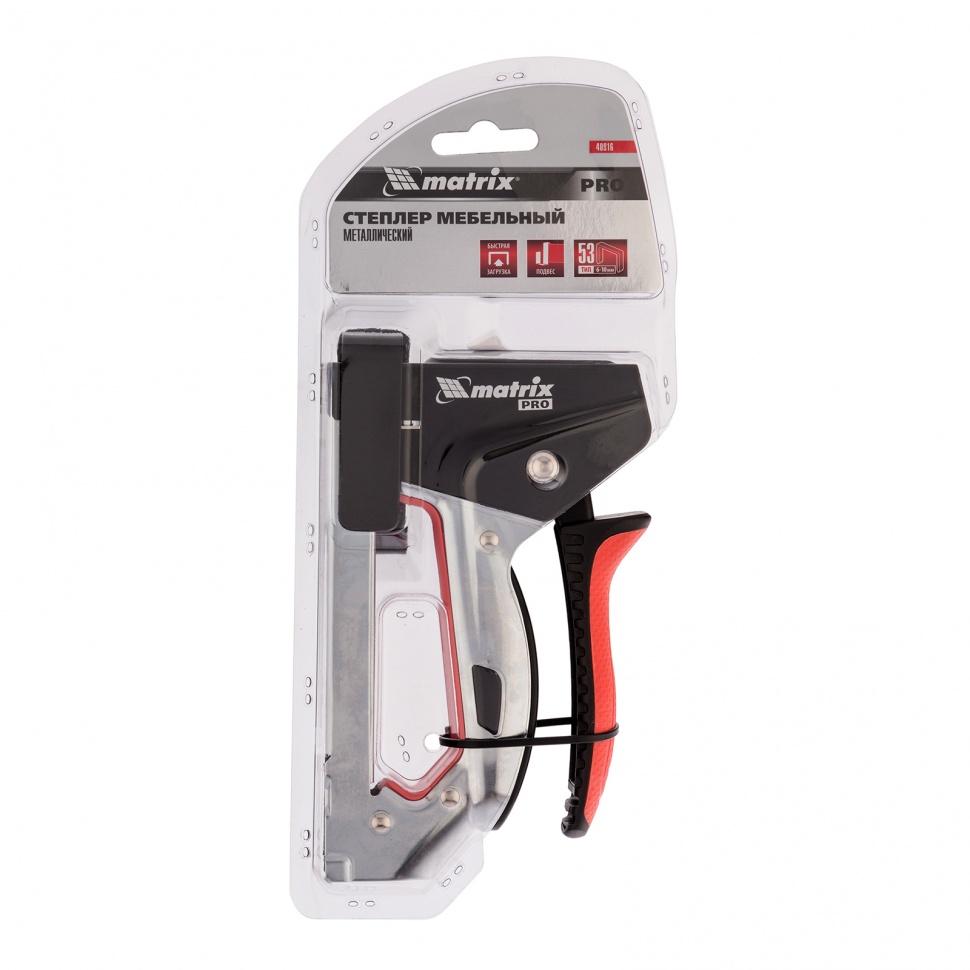Стальной мебельный степлер Matrix PRO 40916 с быстрой загрузкой совместим со скобами типа 53 размером 6-10 мм и позволяет быстро зафиксировать на деревянном основании фанеру, оргалит, ДВП, ДСП, пленку ПВХ или изоляционный материал. Механизм быстрой загрузки скоб экономит время мастера. Инструмент поставляется с крючком для подвешивания на ремень. Степлер используют для обивки или сборки мебели, проведения теплоизоляционных и отделочных работ, укладки ковровых покрытий.