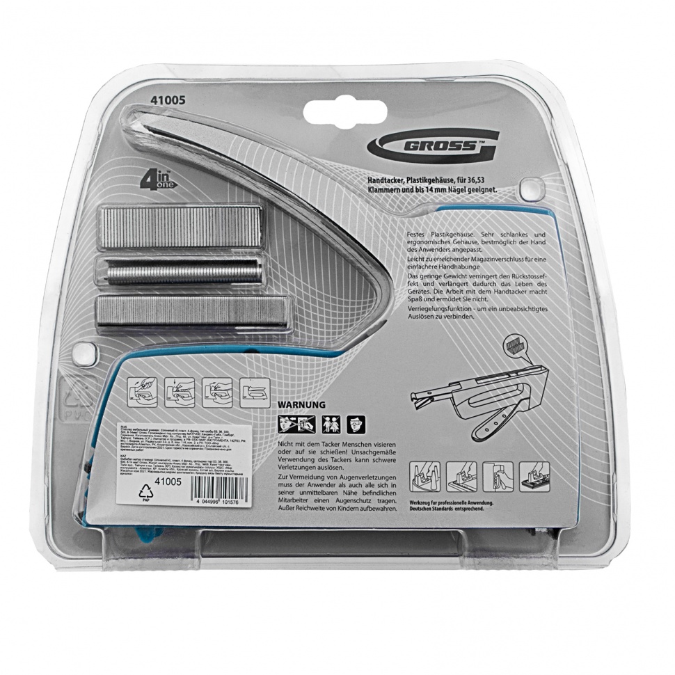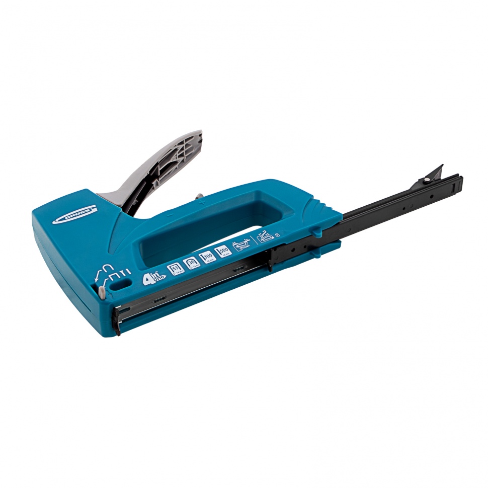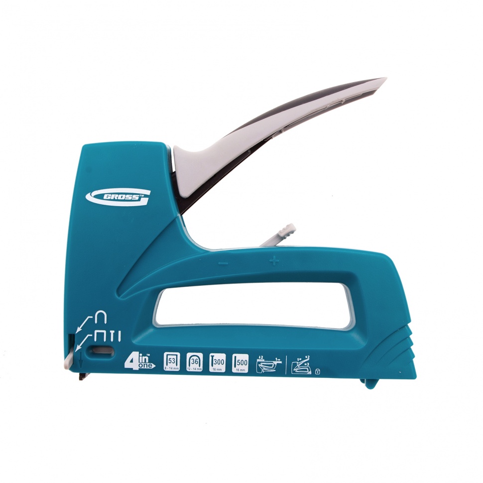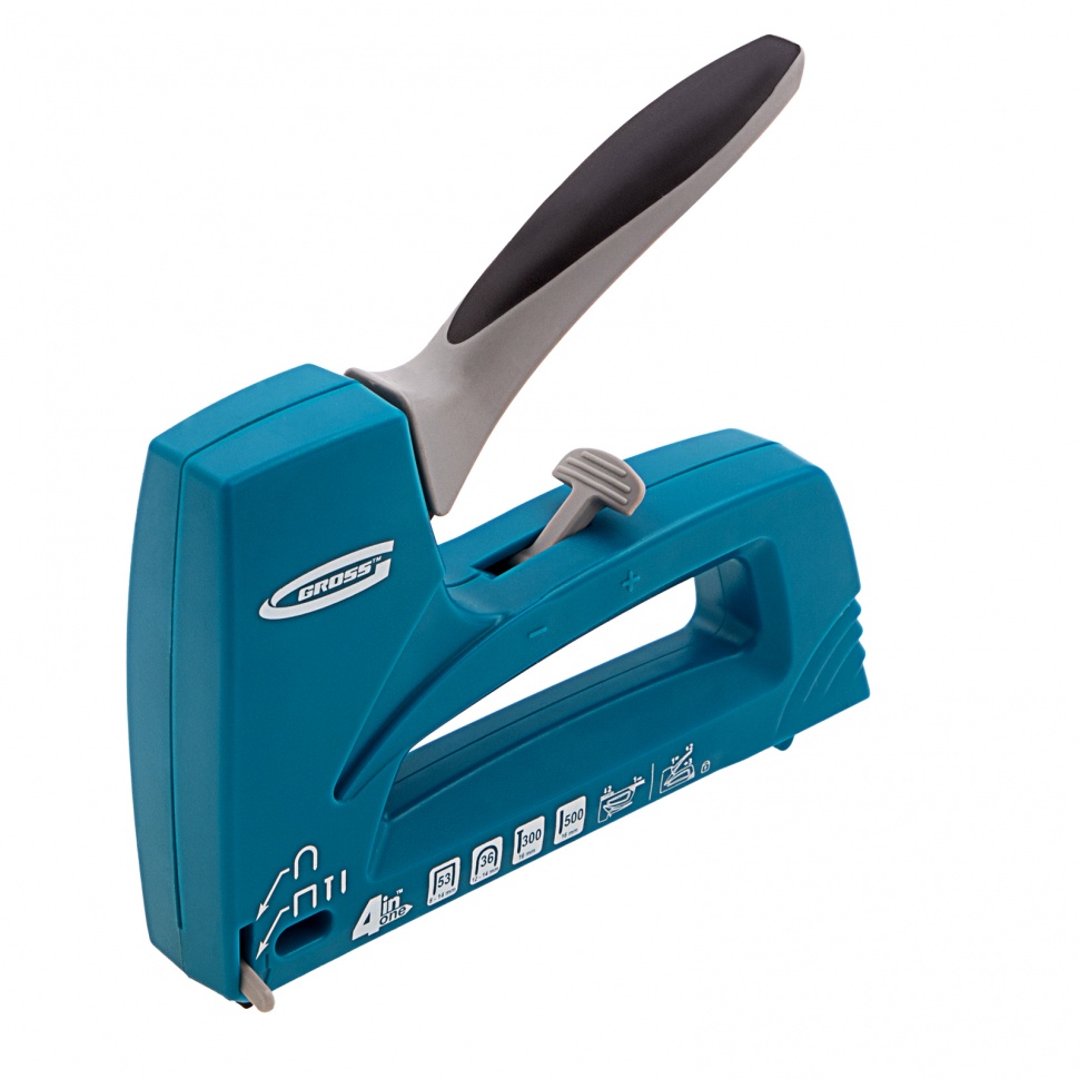 Пластиковый мебельный степлер Gross Universell 4 41005, 4-функциональный, — универсальный инструмент, совместимый со скобами типа 53 размером 8-14 м, 36 размером 12-14 мм, гвоздями типа 300 и штифтами типа 500 размером 16 мм. Предназначен для скрепления с деревянным основанием фанеры, картона, ДСП, ДВП, оргалита, пленки, утеплителя и других листовых материалов. Его используют для обивки мягкой мебели, сборки шкафов, монтажа низковольтных проводов, выполнения багетных и других крепежных работ.