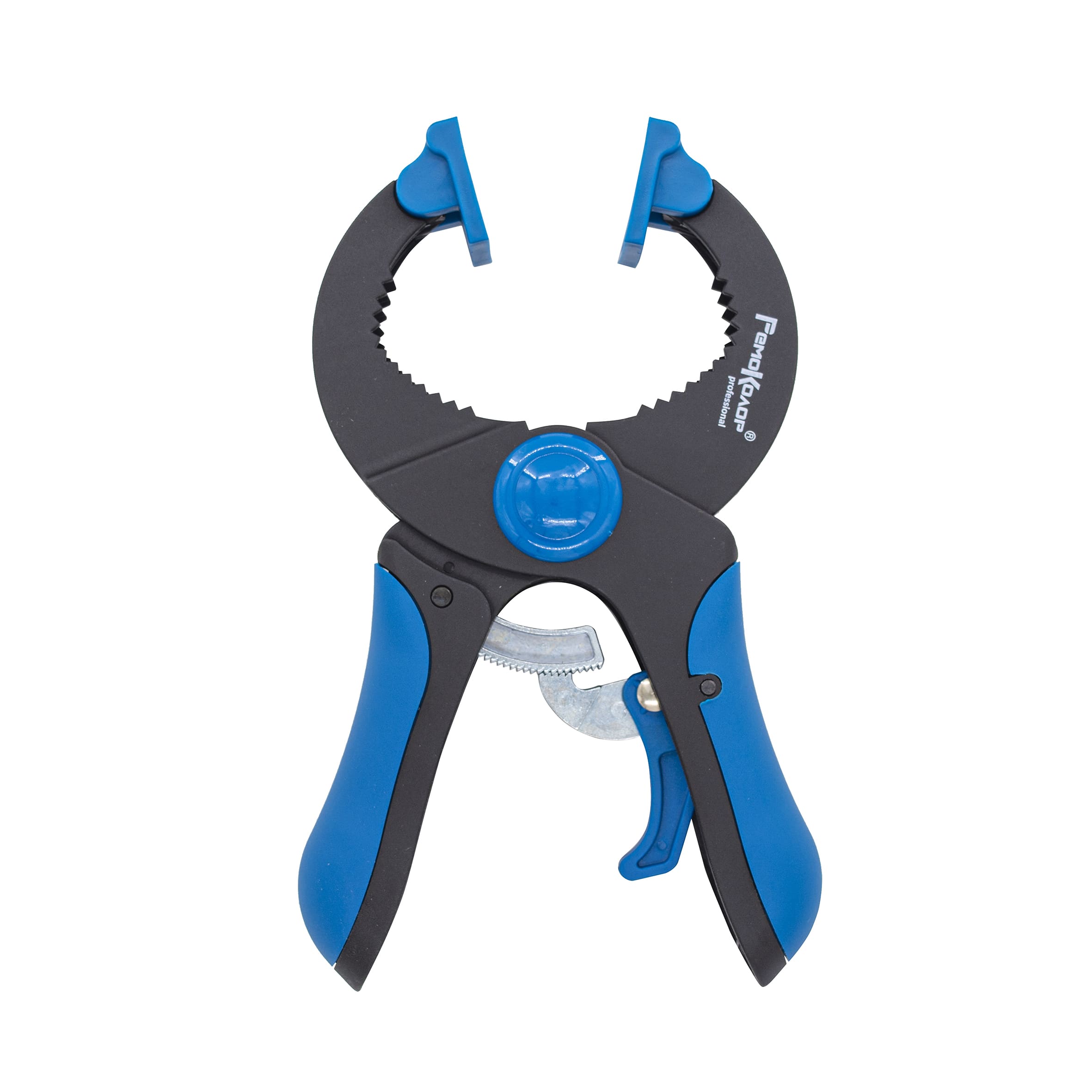 Материал: Корпус струбцины выполнен из пластика с резиновыми накладками. Оси, крепежные элементы и храповый механизм выполнены из стали. Служит для удержания различных деталей и заготовок во время работы. Храповой механизм обеспечивает надежную и жесткую фиксацию заготовок в отличие от механизма пружинных струбцин прищепочного типа. При нажатии на курок происходит мгновенное раскрытие струбцины.