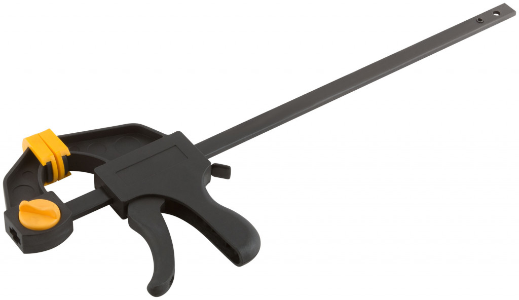 Быстрозажимная. Для фиксации деталей. Может использоваться как распорка при перестановке губок. Материал: нейлоновый корпус, армированный фибергласом, направляющая из инструментальной стали, пластиковые губки.