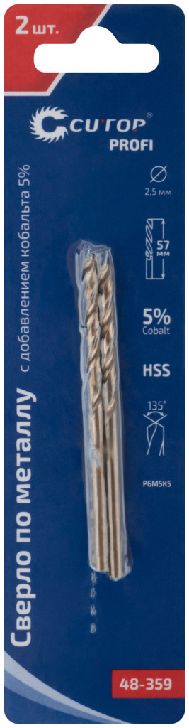 Профессиональное сверло по металлу CUTOP Profi с добавлением кобальта 5% для профессионального использования. Класс точности А1. Цилиндрический хвостовик. Угол заточки 135°. Предназначено для сверления отверстий в углеродистых и легированных сталях, серых и ковких чугунах, цветных металлах и пластике. Материал: быстрорежущая HSS сталь c добавлением кобальта 5% (Р6М5К5). Упаковка: блистер.