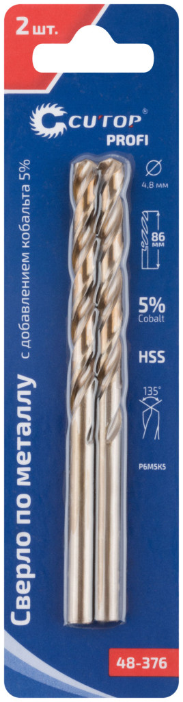 Профессиональное сверло по металлу CUTOP Profi с добавлением кобальта 5% для профессионального использования. Класс точности А1. Цилиндрический хвостовик. Угол заточки 135°. Предназначено для сверления отверстий в углеродистых и легированных сталях, серых и ковких чугунах, цветных металлах и пластике. Материал: быстрорежущая HSS сталь c добавлением кобальта 5% (Р6М5К5). Упаковка: блистер.