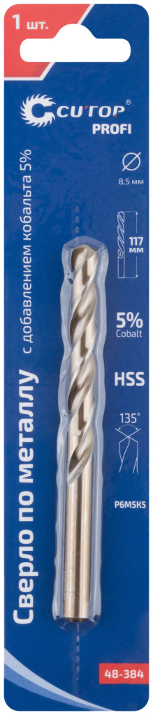 Профессиональное сверло по металлу CUTOP Profi с добавлением кобальта 5% для профессионального использования. Класс точности А1. Цилиндрический хвостовик. Угол заточки 135°. Предназначено для сверления отверстий в углеродистых и легированных сталях, серых и ковких чугунах, цветных металлах и пластике. Материал: быстрорежущая HSS сталь c добавлением кобальта 5% (Р6М5К5). Упаковка: блистер.