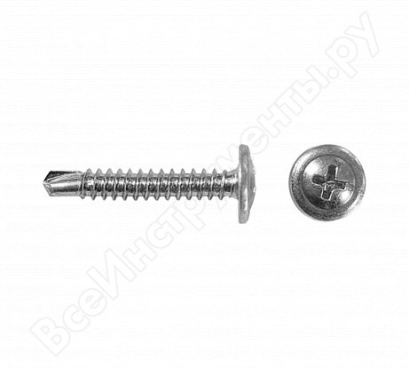 Саморез используется для крепления листов металла тощиной до 2 мм без предварительного сверления. Имеет галетную головку с пресс-шайбой, крестообразный шлиц Phillips №2, наконечник - сверло.