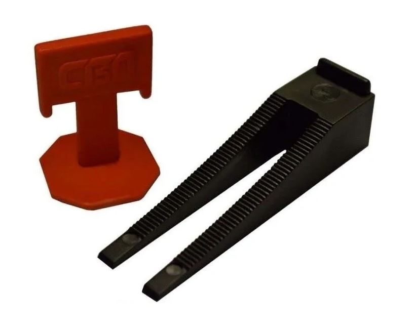 Система выравнивания плитки состоит из двух элементов клин и зажим. Зажим – размещается снизу под боковыми кромками двух соседних плиток, клин — прижимает две смежные плитки, с целью придания им одного уровня. В данном наборе 50 зажимов и 50 клиньев. Позволяет уложить плитку на горизонтальных и вертикальных поверхностях. Обеспечивает идеально ровный шов. Предотвращает «проседание» и «выпячивание» плитки в процессе затвердевания клея. Межплиточный шов 1,4 мм, толщина основания 1,8 мм, толщина плитки 3-12 мм. Использование СВП существенно упрощает процесс укладки плитки и керамогранита.