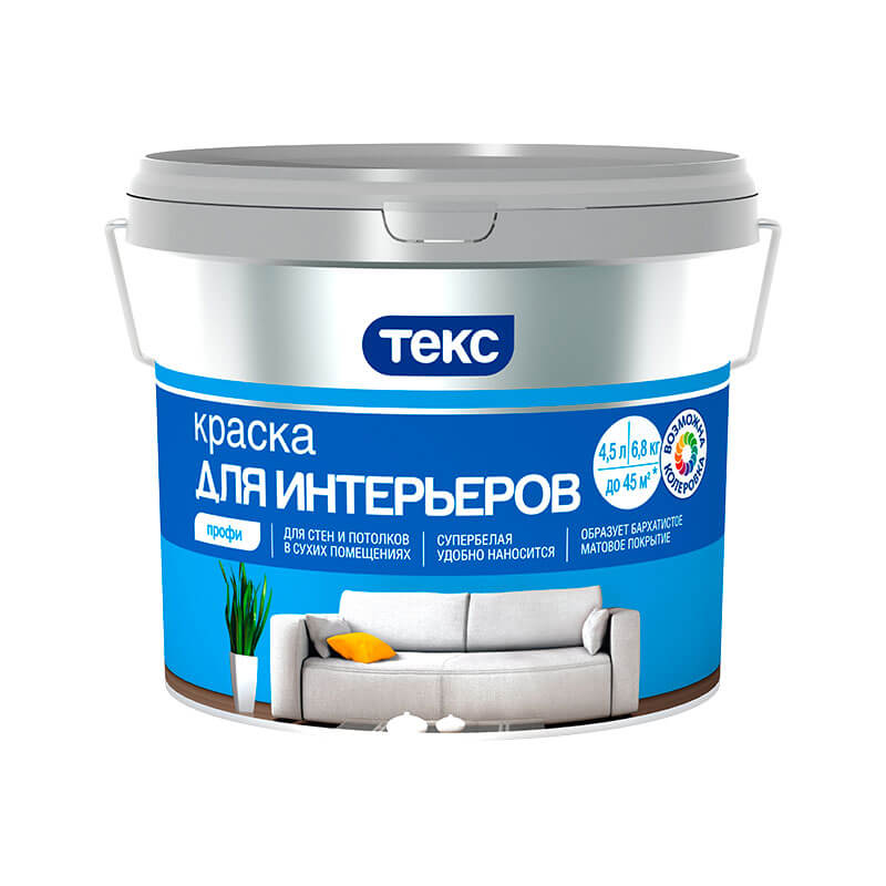 Колеровка по каталогу цветов ТЕКС или колер красками «Профи» ТЕКС в пастельные тона. База А может использоваться в качестве белой краски.