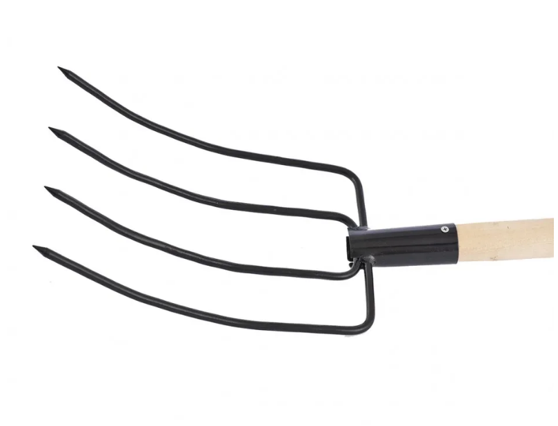 Комфортная работа — деревянный черенок обеспечивает удобный хват, а рога с острыми концами надежно захватывают траву и сено.