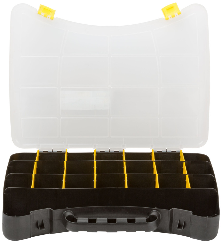 Пластиковый с защелками. Переставные перегородки. 22 отделения для крепежа.